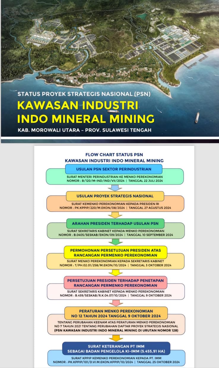 Peraturan Menko Perekonomian No. 12 Tahun 2024 (9 Oktober 2024), memasukkan Kawasan Industri Indo Mineral Mining sebagai PSN dengan urutan nomor 128.