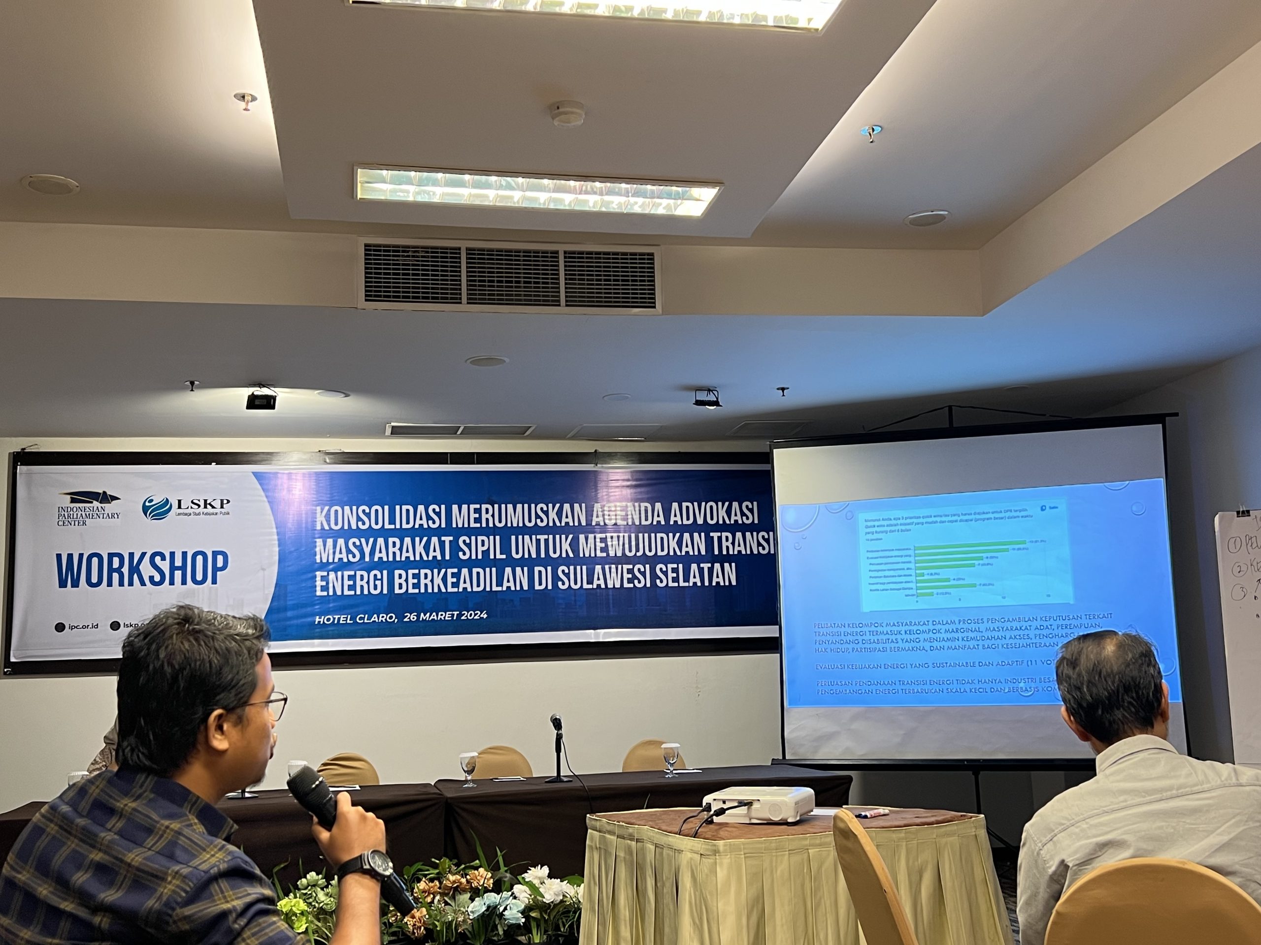 Untuk itu Indonesian Parliamentary Center (IPC) bersama Lembaga Studi Kebijakan Publik (LSKP) mengadakan sebuah workshop yang bertujuan untuk merumuskan Agenda Advokasi Masyarakat Sipil untuk Mewujudkan Transisi Energi Berkeadilan di Sulawesi Selatan.