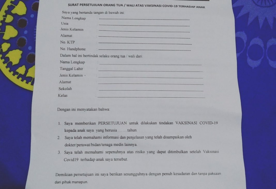 “Kami bukannya tidak setuju anak-anak divaksin. Silakan (divaksin), tapi kami tidak setuju adanya surat pernyataan menerima risiko pasca vaksin yang dikeluarkan pihak sekolah, artinya kan mau lari dari tanggung jawab, “terangnya.