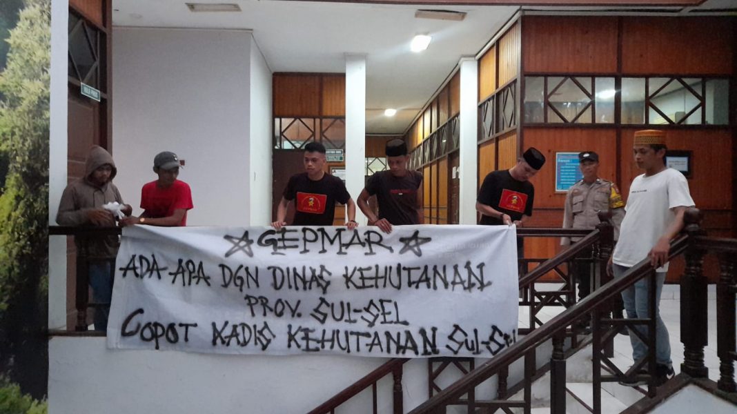 MAKASSAR,UPOS.ID — Tidak terima dengan hasil tim terpadu Dinas Kehutanan yang dianggap tidak melakukan investigasi serius, Gerakan Pemuda dan Mahasiswa Makassar (GEPMAR) mendatangi kantor Dinas Kehutanan Sulawesi Selatan, Jumat 22 April 2022.