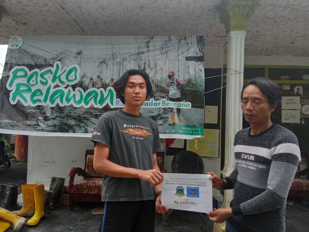 Bantuan senilai Rp.4.650.000 itu disalurkan ke warga terdampak bencana erupsi Semeru melalui relawan bencana kolaborasi rumah sadar bencana Malang.”Posko kami di dekat lokasi bencana bang, desa oro2 ombo kecamatan pronojiwo kab.lumajang (kami) Kolaborasi bang.. saya dr Ipka Indrakila Malang.. kawan2 lain ada yg dari gimbal alas, imapala unmer,dll,” jelas Mahardika salah satu relawan bencana yang masih bekerja di daerah bencana saat dihubungi lewat pesan singkat WhatsApp.
