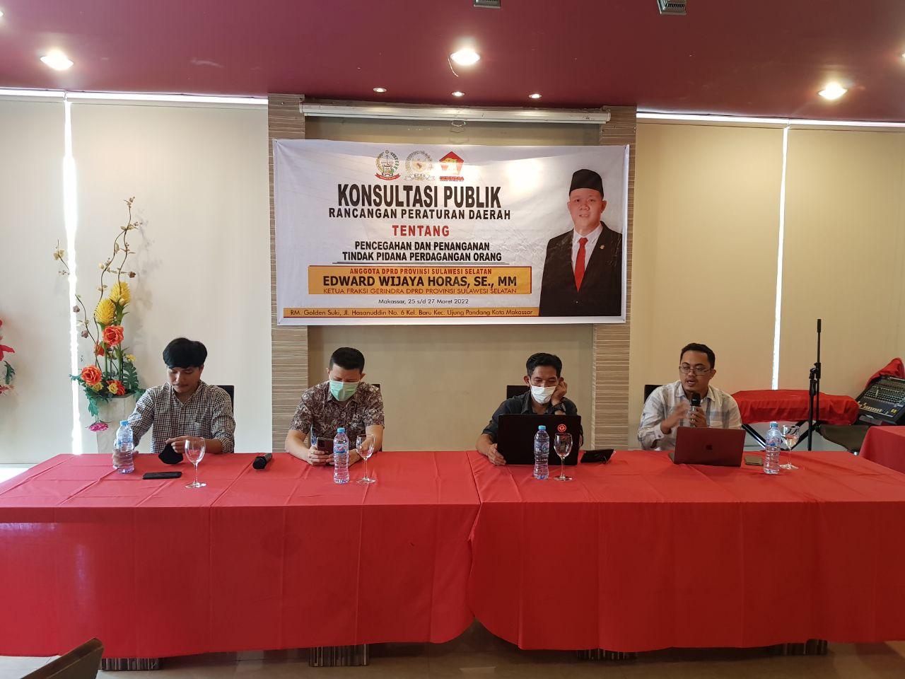 Ketua Fraksi Gerindra DPRD Sulsel Gelar Konsultasi Publik Ranperda Pencegahanan dan Penanganan Tindak Pidana Perdagangan Manusia