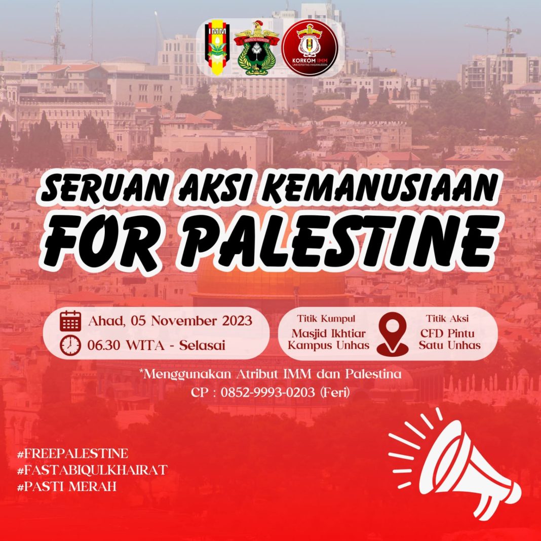 Upos.id, Makassar- Koordinator Komisariat Ikatan Mahasiswa Muhammadiyah (IMM) Universitas Hasanuddin akan mengerahkan massa aksi kemanusiaan bela Palestina di Car Free Day Pintu Satu Unhas pada Ahad 5 November 2023. Ketua Korkom IMM Unhas mengatakan bahwa aksi ini sebagai bentuk pembelaan dan bantuan kita ke Palestina, ia menegaskan tidak ada lagi penjajahan di atas dunia ini.