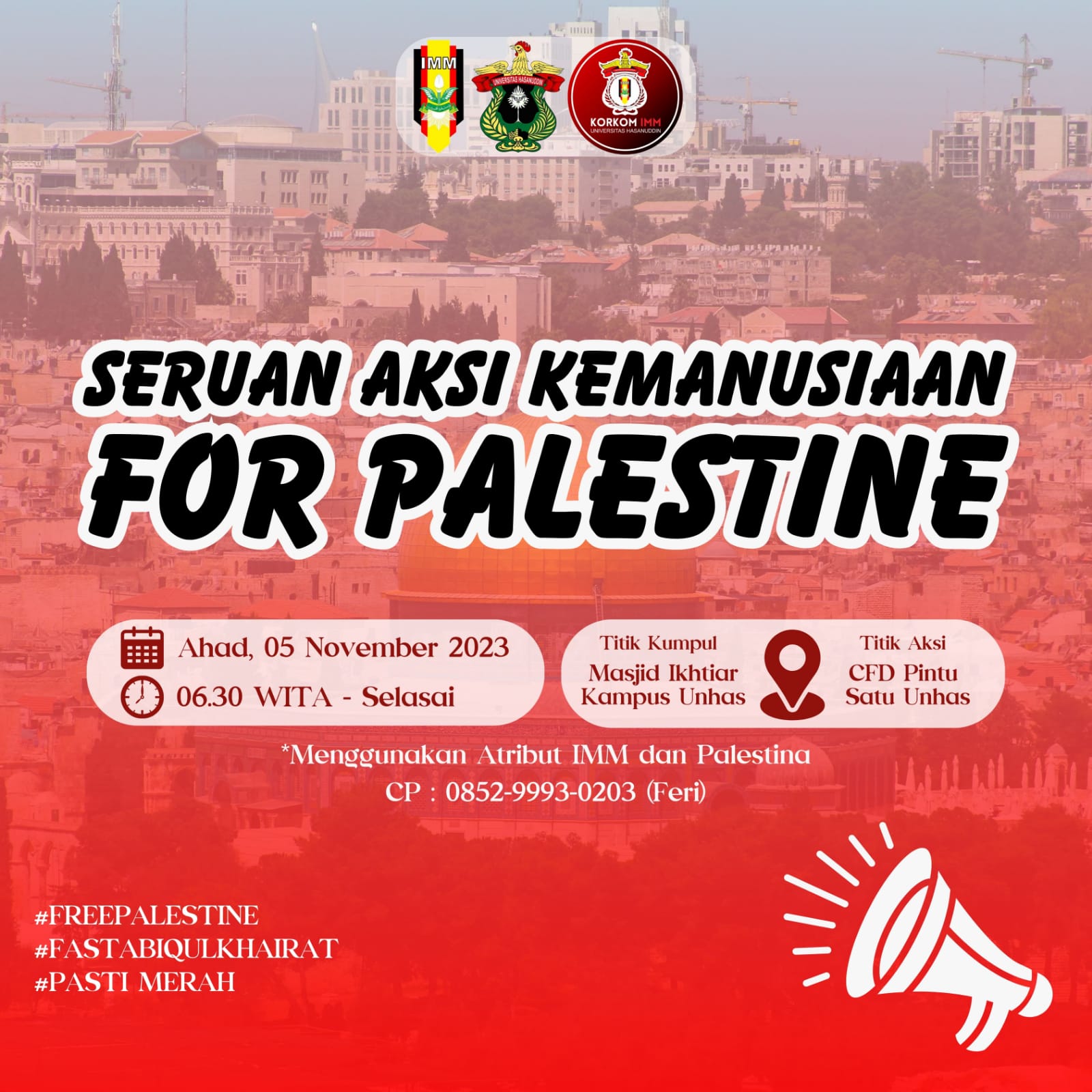 “Kami mengajak kepada seluruh pihak baik mahasiswa dan masyarakat umum untuk ikut serta dalam aksi kemanusiaan ini, aksi ini salah satu bentuk dukungan dan kepedulian kita kepada saudara kita di Palestina”, ujarnya.