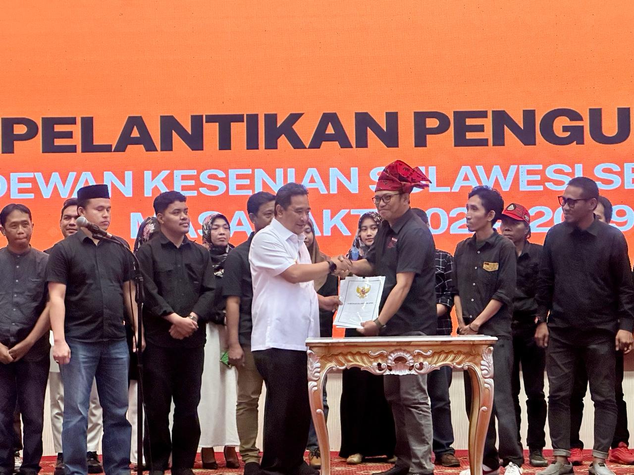 MAKASSAR,UPOS.ID— Pj Gubernur Sulawesi Selatan, DR Bahtiar Baharuddin melantik pengurus Dewan Kesenian Sulawesi Selatan (DKSS) periode 2024-2029 di Aula Tudang Sipulung Rumah Jabatan Gubernur Sulsel, kota Makassar, Kamis 14 Maret 2024.