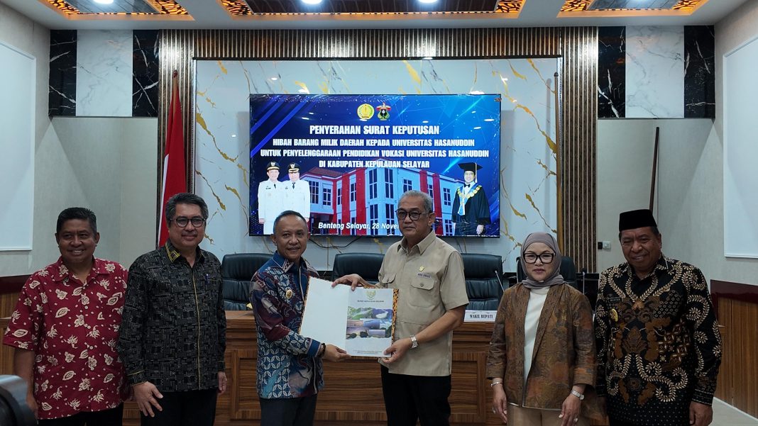 Penyerahan SK Hibah Barang Milik Daerah ini menandai dukungan resmi pemerintah daerah terhadap penguatan sarana-prasarana pendidikan vokasi Unhas di Kepulauan Selayar.