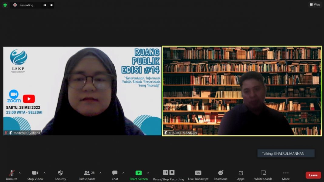 Upos.id, Makassar – Lembaga Studi Kebijakan Publik (LSKP) menggelar kegiatan Diskusi Ruang Publik Seri Ke-14. Kegiatan yang mengangkat tema Keterbukaan Informasi Publik Untuk Pemerintah Yang Inovatif diadakan secara daring via zoom meeting (28/5/2022)