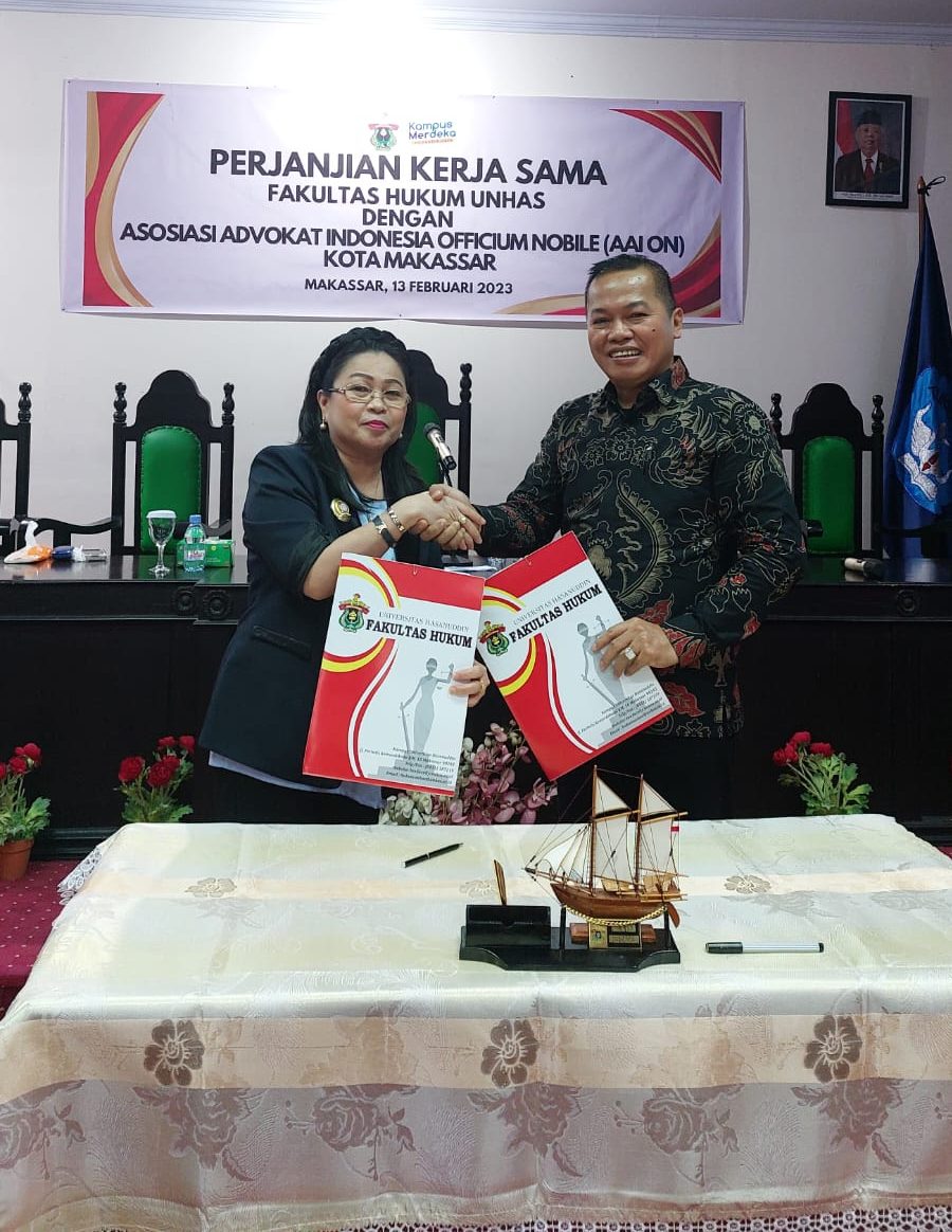 Upos.id, Makassar- Dalam rangka Dies Natalis ke-71, Fakultas Hukum Unhas melaksanakan penandatanganan Perjanjian Kerja Sama dengan Asosiasi Advokat Indonesia Officium Nobile (disingkat AAI ON). Pelaksanaan tersebut tertuang dalam Perjanjian Kerja Sama yang ditandatangani oleh Dekan Fakultas Hukum Unhas (Prof. Dr. Hamzah Halim, S.H., M.H.,M.A.P) dan Ketua AAI ON DPC Makassar (Dr. Metsie T. Kandou, S.H.,M.H). Penandatanganan berlangsung di Ruang Video Conference, Fakultas Hukum Unhas, Makassar pada Senin (13/02/2023).