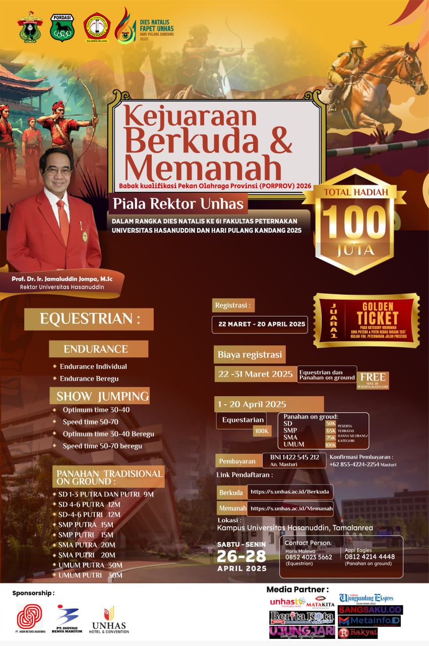 Kejuaraan Berkuda dan Memanah ini akan memperebutkan Piala Rektorat Unhas. Khusus untuk kategori Berkuda akan membuka dua kelas equsterian yaitu endurance dan show jumping. Kejuaraan tersebut sekaligus menjadi babak kualifikasi peserta Pekan Olahraga Provinsi (Porprov) mendatang. Sementara untuk kategori Memanah, kami membuka sembilan kelas mulai dari tingkat SD, SMP, SMA dan peserta umum, baik putera maupun puteri” tambah Sahir yang juga merupakan Kasubdit Pendidikan dan Pengembangan Kompetensi Unhas.